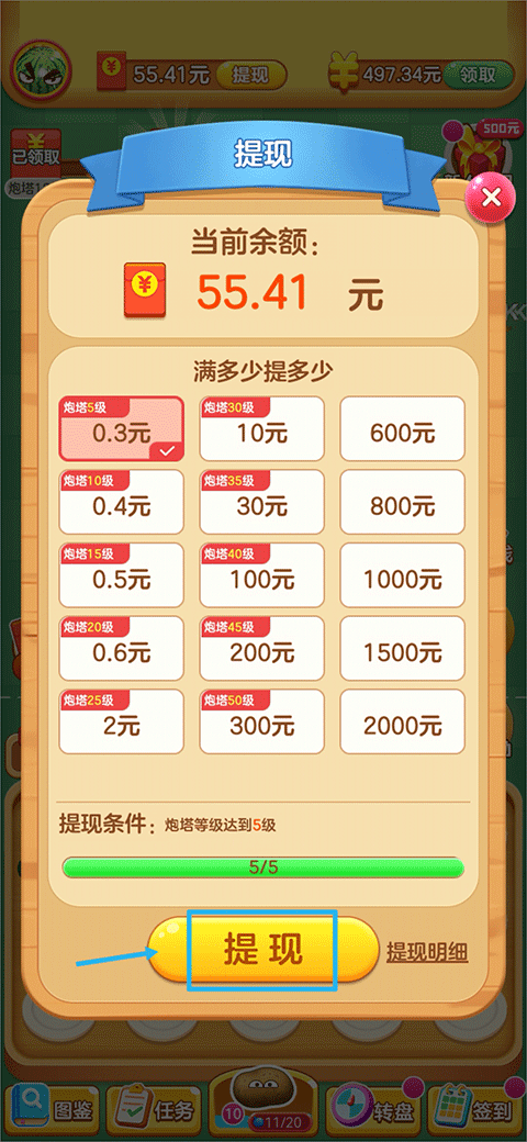 5、当炮塔等级达到可提现红包的标准时,挑选一个可提现的金额并点击提现按钮即可。