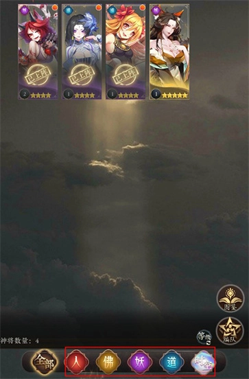 1. 游戏里的神将划分为人、佛、妖、道、时空这五种类型,当中时空属于特殊神将,实力极为强劲。