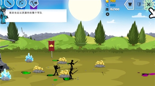 6、此外,还能够组建火柴人阵容。在这种情况下,只需点击右上角的全体进攻图标,所有火柴人便会向着敌人发起进攻。