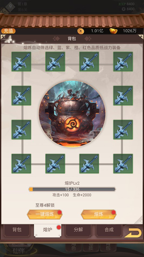 3、在游戏过程中,玩家能够获取大量装备。对于一些多余的低级装备,可通过背包进行熔炼,从而得到大量金币、宝石以及经验等。