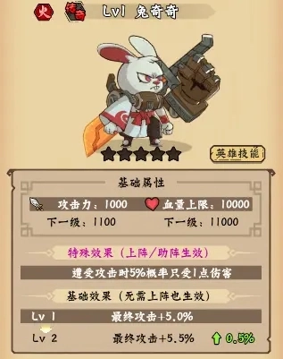 把体力转化为力量!花木兔的血量越多,伤害就越强劲!拥有高输出与高血量,闯荡武林关卡毫无压力!