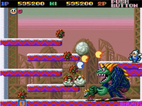 3、《雪人兄弟》有一个比较有意思的设定,玩家只要能够坚持一段时间就可以直接过关,BOSS打不打死都无所谓。小编尝试过在不清敌兵的情况下,直接跳到BOSS背后使用普通攻击。然而一直拖到过关BOSS都没有被打死,也就是说BOSS很有可能是无法使用子弹打死的。但真的是这样吗?