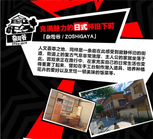 人文荟萃之地,同样是一条能在此感受到寂静怀旧的街道,街道上的复古气息非常浓厚,主人公的家就坐落于此。因双亲正在旅行中,在家充实自己的日常生活也变得重要了起来,譬如在手工台制作潜入道具、培养种植花卉的爱好以及烹饪一顿美味的饭菜等。