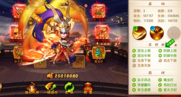 既然是围绕三国杀名将传周姬打造的阵容,那么我们至少要将她养到涅槃三(当然涅槃五更好),全装备自然不用多说,堆自己最好的上去就行;但是神兵是必须要有的,不仅可以对敌方造成最大生命值伤害,还能有效提升自己的坦度,可以说是如虎添翼。