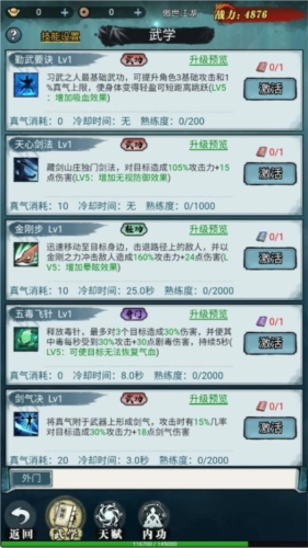 2、别忘了激活游戏中的武学技能,这可是提升战力、闯关必不可少的。