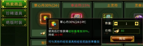 二、购买草心丹。草心丹能够让你在24小时内,打怪获取的经验提升30%,并且该效果可与其他经验道具及经验奖励的效果相叠加。