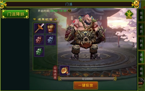 在门派之中,我们能够参与趣味十足的活动玩法——门派降妖。与门派成员携手召唤妖兽,齐心协力将其击杀,进而获取奖励。除此之外,还能用“门派贡献”在门派商店购买那些物美价廉的道具,亦或是组织各类团建活动等等。