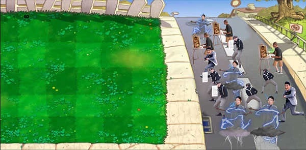 5、把卡片拖到右侧绿色的方块草坪上,进行合理布局,以有效阻挡明星僵尸们的进攻。第一排与第二排的放置方式,建议参照图示。