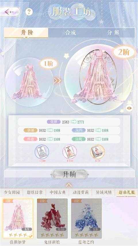 小主获取套装后,能够在服装工坊对套装进行升阶操作,从而得到属性提升以及额外的套装展示效果。不仅如此,在服装工坊,还能消耗服装合成材料与金币来合成服装,同时可分解多余时装,以获取套装升阶所需材料。