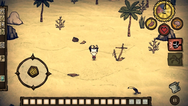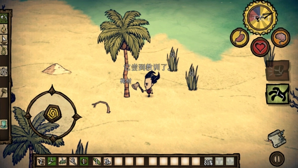 3、角色移动可通过左侧轮盘控制,而生存天数、健康值以及饥饿值会显示在右上方。