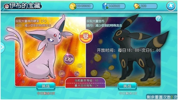 伊布所藏的宝藏分为太阳与月亮两类。其中太阳宝藏具备较高的防御能力,挑战成功后会掉落精灵经验道具;月亮宝藏则有着较高的特防能力,战胜它能够获取大量金币。在每日特定的时间段内,玩家只要参与挑战,就能收获丰厚的资源奖励。当玩家的等级达到35级、40级、50级等阶段时,副本的难度会随之提高,相应的奖励也会愈发丰富。