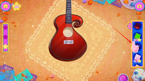进入对应场景后,选择“Guitar Making”选项,接着使用界面右侧的材料,通过点击操作来装饰吉他,直至完成整个制作流程。