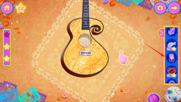 挑选各类装饰素材进行搭配,点击应用到吉他上,就能打造出独一无二的样式,还能解锁全新关卡。