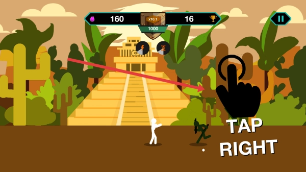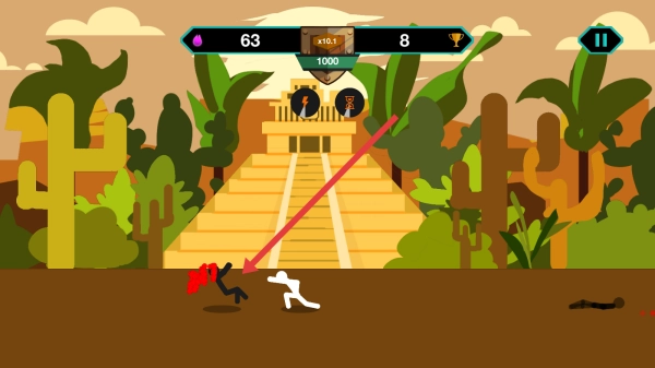 战斗时,你要操控那个被红箭头指着的火柴人,在玛雅金字塔的场景里,和敌人近距离搏斗,使出攻击招式。