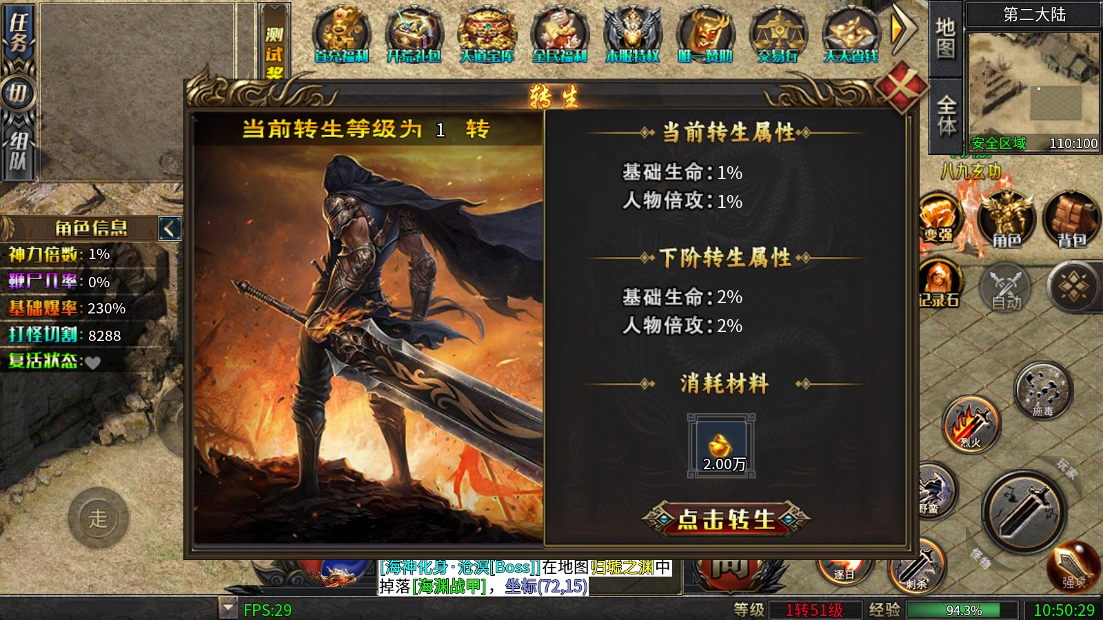 转生:消耗元宝就能进行转生操作,以此提升基础生命值与人物倍攻属性。