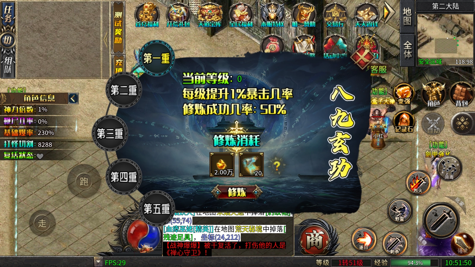 八九玄功:修炼需消耗元宝与玄功残页,共设五重境界。每提升一重境界的等级,都能获取相应的属性加成;当等级达到特定要求时,还可额外获得对怪物的伤害加成以及对怪物的爆率加成。
