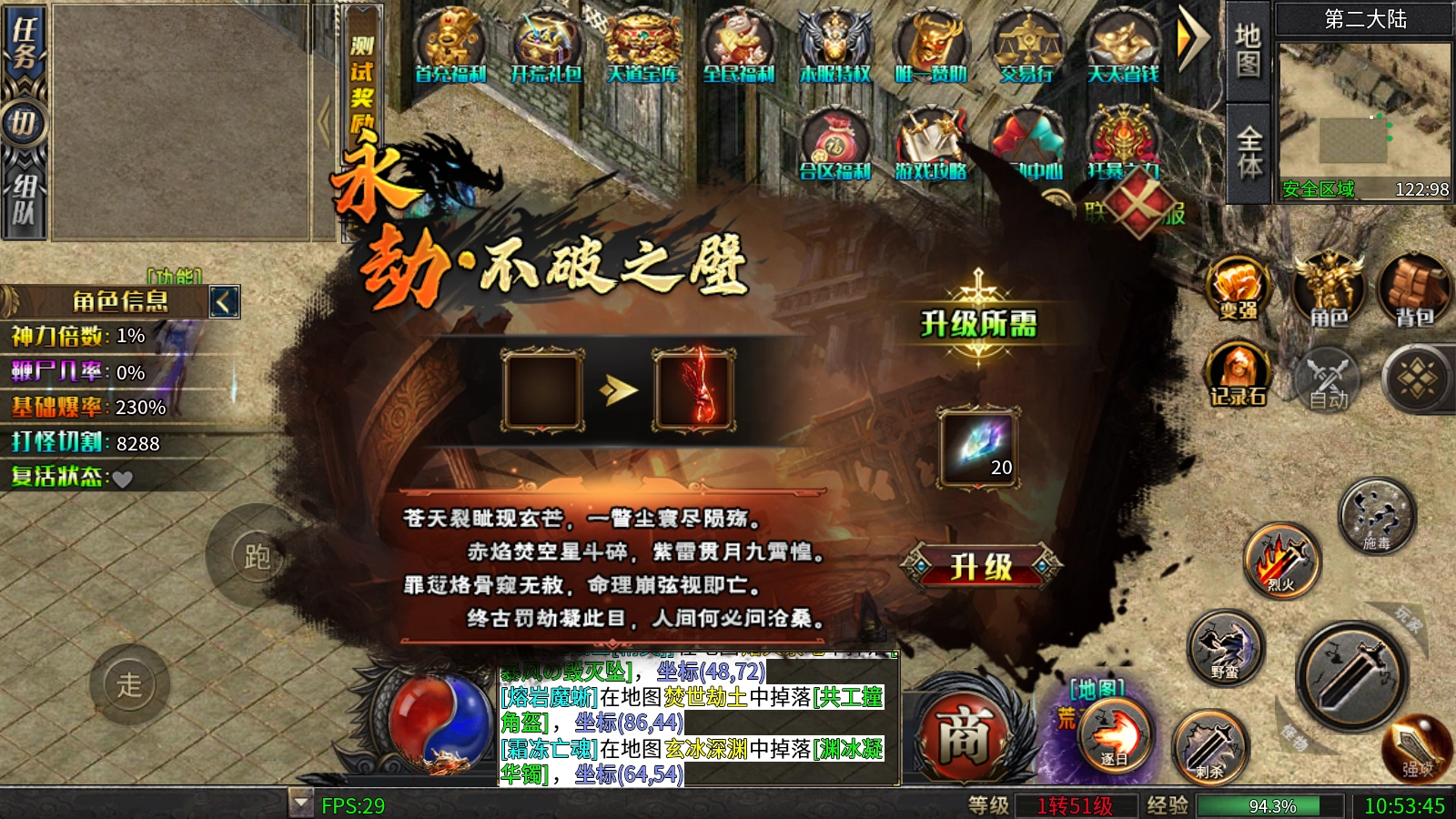 不破之壁:通过消耗鸿蒙石提升等级,可获取攻魔道基础属性,以及各类元素属性。