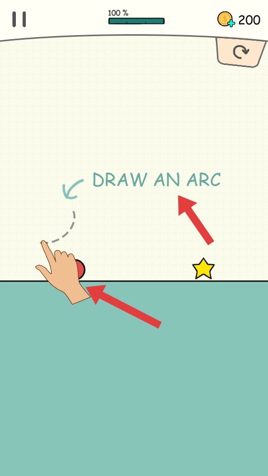 接下来,在操作提示界面出现“DRAW AN ARC”的提示时,依照该提示用手指画出弧线,引导红色小球朝着星星所在的方向移动。