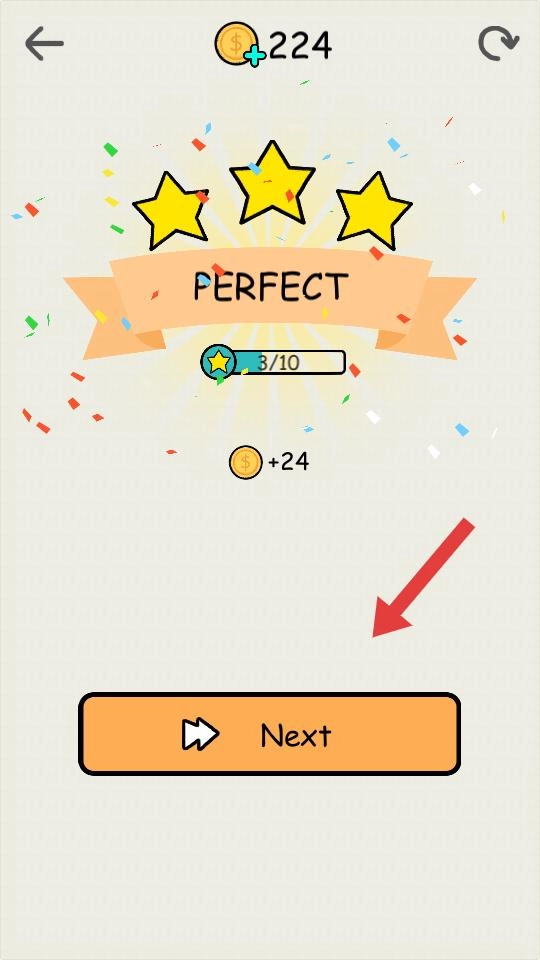 最后,当顺利通过关卡后,界面会呈现PERFECT字样以及获得的金币等信息,点击Next按钮,即可进入下一关继续游戏。