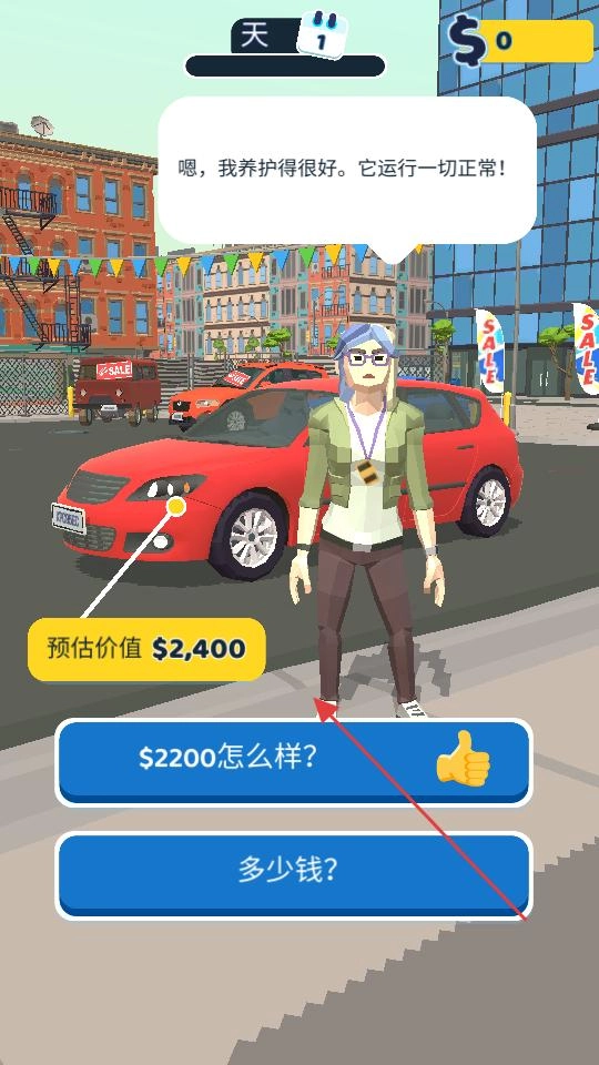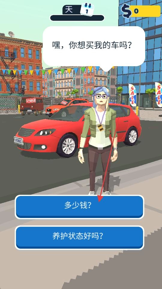 街头碰到卖车的人,他旁边停着一辆待售的红色车子,我点击了“多少钱”的选项,主动和对方搭话,询问车辆的价格,正式开启了交易相关的对话流程。