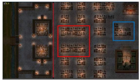 推荐出战角色为张紫嫣和尚怀忠(若拥有罗松则优先上罗松);有窦线娘的玩家务必让窦线娘出战,她的没羽箭攻击可以覆盖相邻民居,实用性很高;张紫嫣则负责加好强行状态。如果已经触发了伏兵,可以先在红框内的民居清理完伏兵,再分兵向上下两路清理刺客。也可以让大部队在红线附近守株待兔,派移动速度快的角色去“踩雷”(即触发刺客出现),把刺客都引出来。
