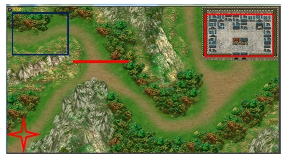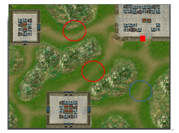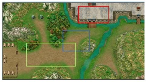 这里有个关键要点:不要急于触发秦琼与尉迟恭的单挑,应先派遣1个步兵占据红框下方的城门,再触发秦琼和尉迟恭的单挑。单挑结束后,尉迟恭会暂时退却,下一回合他会带着一波兵在城外蓝框内出现,此时红框内的敌军会无限复生,但由于有步兵卡位,他们的威胁并不大。