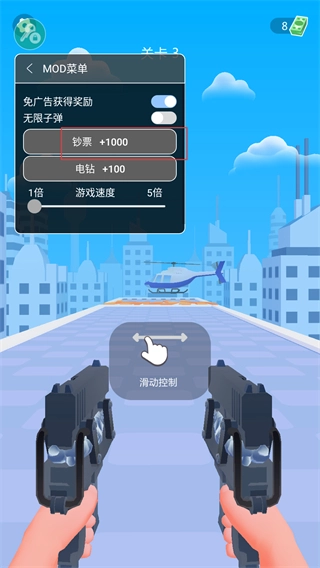 玩家能够点击打开MOD菜单,启用钞票增加功能,从而获取海量游戏内资源,这些资源可用来购买和升级武器,提升自身的战斗能力。