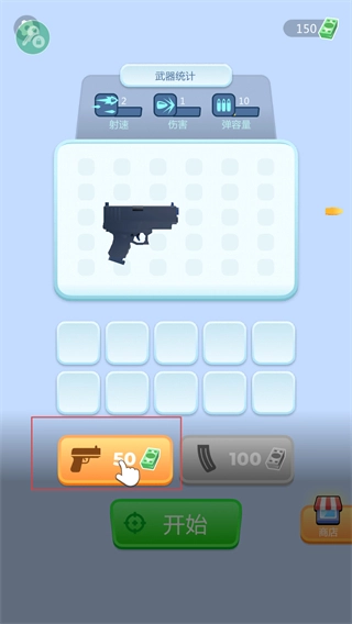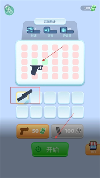 玩家可以通过持续收集资源,对武器的射速、伤害、弹匣容量等属性进行升级,待准备工作完成后,点击“开始”按钮即可进入关卡。