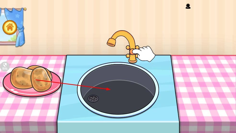 找到并点击水龙头的开关,往水槽里注入适量的水,接着把土豆放进水槽中清洗。