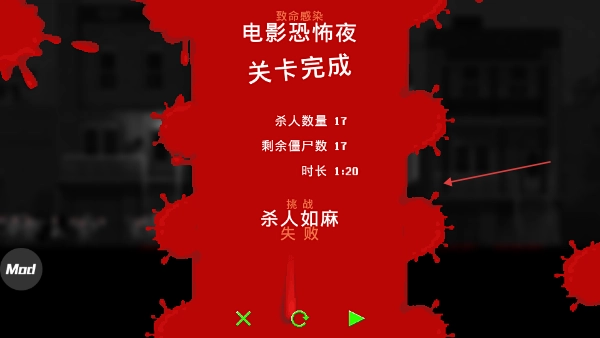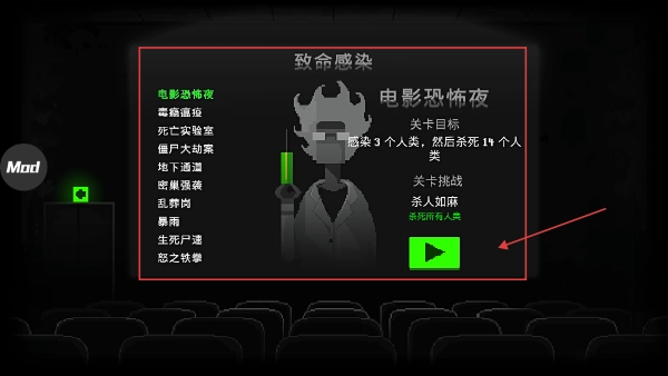 进入【致命感染】-【电影恐怖夜】关卡,点击绿色播放按钮启动游戏,先按目标感染3人,再消灭剩余的人类。
