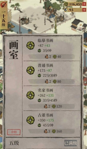 这个画院能获取大量铜钱,得及时把它升到满级(升级需要补天石),一旦满级,生产时间就会减半。