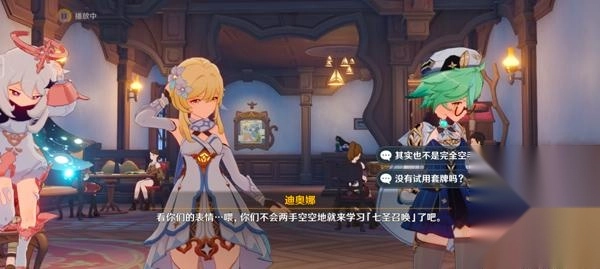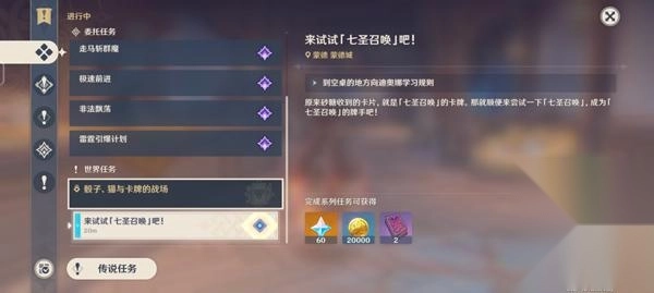 要打开原神游玩七圣召唤,首先得完成前置任务“骰子、猫与卡牌的战场”。