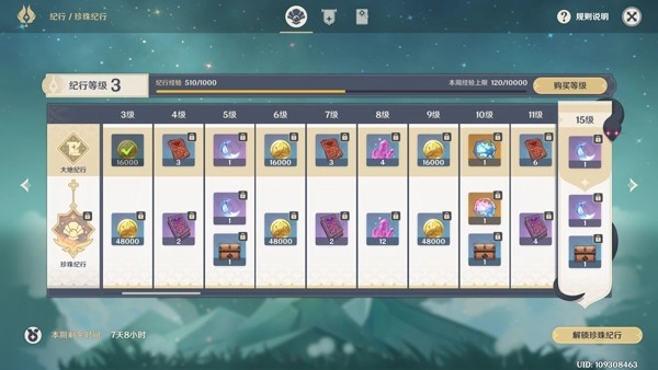 纪行:提升纪行等级,每提升10级可获取一个蓝球,即160原石。