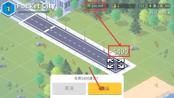 在修建道路的过程中,要留意费用相关的提示信息,比如当显示需花费$400时,需先确认初始资金($50,000)是否充足,确认无误后点击【确认】按钮即可开展建设工作。