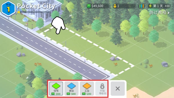 道路修建完成后,点击道路周边的地块,结合当前的资金状况,选择【住宅】【商业】【工业】等不同类型的区域来开展开发工作,以此促进城市的发展。