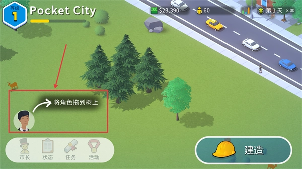 在【PocketCity】游戏里,把角色拖拽到树上触发互动,不仅可以推进前期任务,还能为城市建设积累基础资源和经验。
