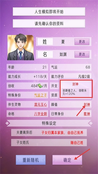 在“人生模拟即将开始”的界面中,先对角色夏如渊的各项设定进行确认——包括颜值“封神”所带来的创收永久提升120%的效果,以及特殊身份等附加的属性加成,之后点击“确定”按钮即可。