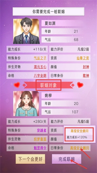 进入“完成一桩联姻”界面后,挑选联姻对象姚柳(其日常身份为“高级安全顾问”,能让能力成长提升120%),接着点击“完成联姻”按钮,对配对关系进行确认。