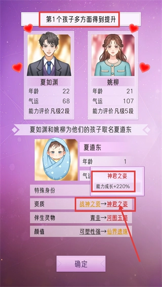 联姻后诞下孩子夏道东,其资质由“战神之姿”提升为“神君之姿”,伴生灵物、颜值等属性也随之同步进阶,请点击“确定”按钮确认孩子的相关信息。