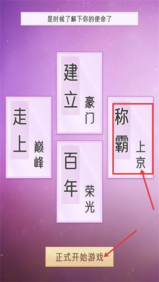 界面呈现人生使命(包含“称霸上京”等目标),点击“正式开始游戏”按钮,即可进入人生模拟玩法。