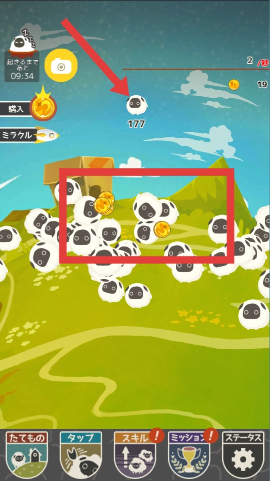 随着小羊数量持续增多,画面里会涌现出大量小羊并生成金币,玩家能够点击金币来收集,也可以点击地面上的技能,以此帮助更快地积累金币和增加小羊数量。