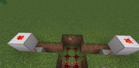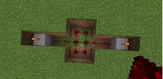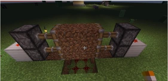 在两侧放置红石火把与点状红石,作用是激活活塞,两侧的布置完全相同。