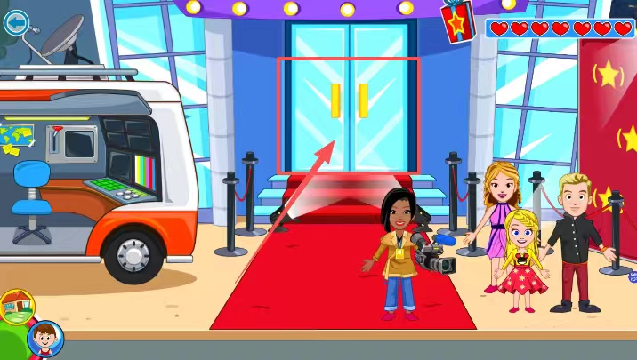 看电视台入口的红毯,瞧一家三口和采访车,点击相关图标就能进入活动现场。