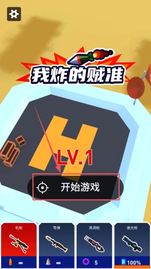 1、进入游戏:映入眼帘的是“我炸的贼准”的标题,点击“开始游戏”按钮即可进入武器选择界面。