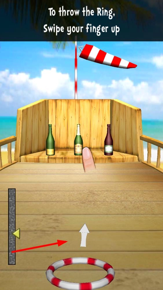2、留意屏幕上瓶子的位置以及风力提示,通过点击屏幕并向前滑动来操控圈圈发射的力度与方向,尽力套中目标。