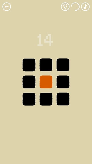 第十四关:每个角块与顺时针方向的第三个块组合时会变黑,需使所有块都变黑(目标状态如第十五关图示)。第十五关:右侧块的作用是让下一个块顺时针旋转90度,左侧块的作用是跳过下一个块,完成一个口字形后,点击中间的黑块。