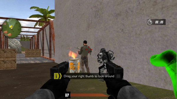 2、进入战场后,玩家需借助掩体逐步推进,通过左摇杆控制移动方向,右摇杆完成瞄准动作,点击对应按钮即可执行射击、蹲伏或跳跃操作。