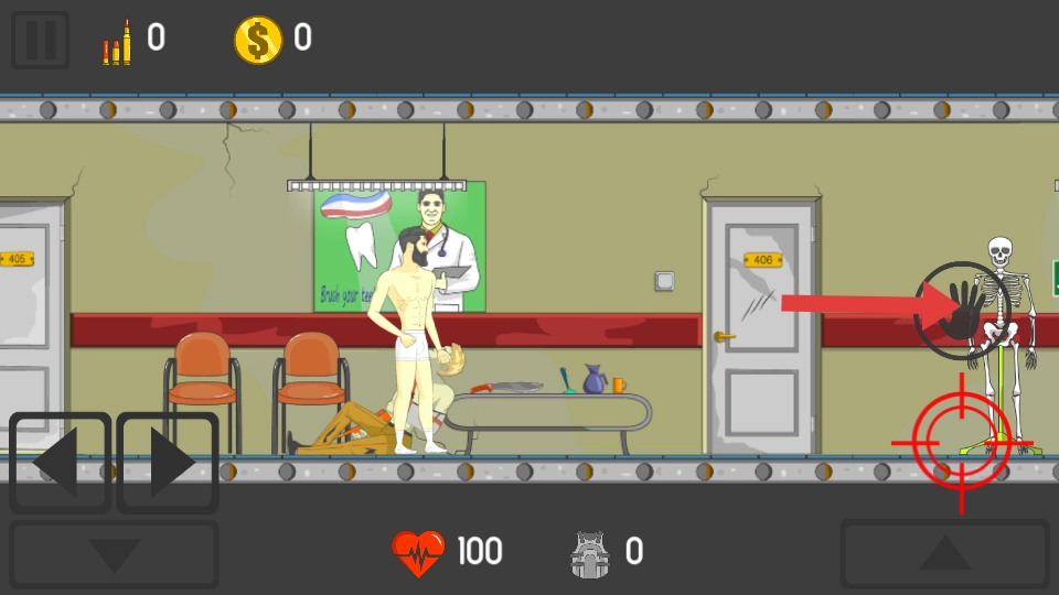 1、借助左下角的方向键来控制角色移动,注意观察带有门牌号的房间,还有走廊里的标识、骷髅模型之类的元素,以此熟悉区域的范围。