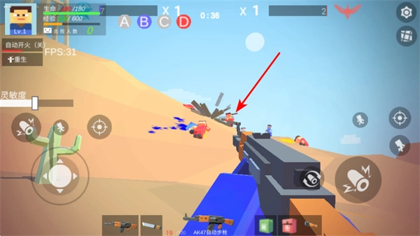 3、对准地面上的敌人开枪射击,这是击败对手的核心策略,要留意敌人的移动走向来提升射击的命中率。