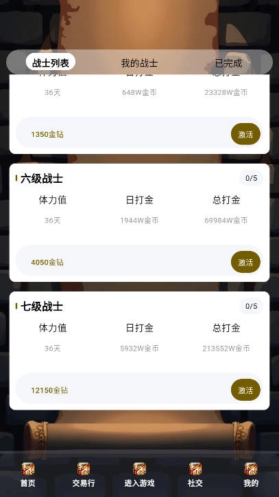 二、可利用金钻与金币兑换更高级别的战士(每位战士的体力值有效期为36天)
